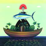 This painting is part of my "ballast" series, pondering balance, especially our relationship to nature. Seriousness, absurdity, a little cheekiness, it's all in there.