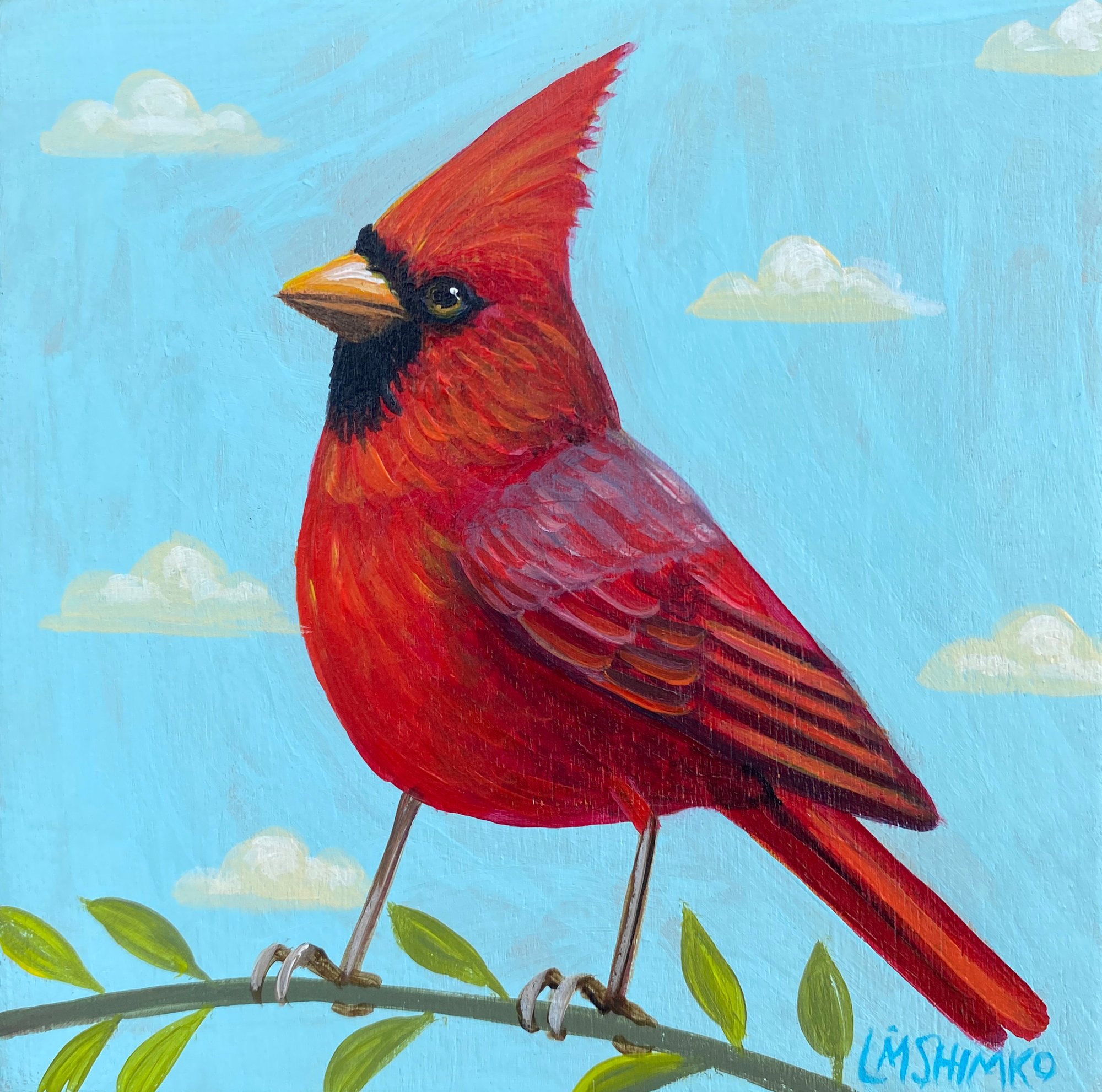 Hello bright one-these birds have built in crowns : ) 4" x 4" x 3/4" thick, acrylic on cradled wood panel, painted sides, ready to hang!